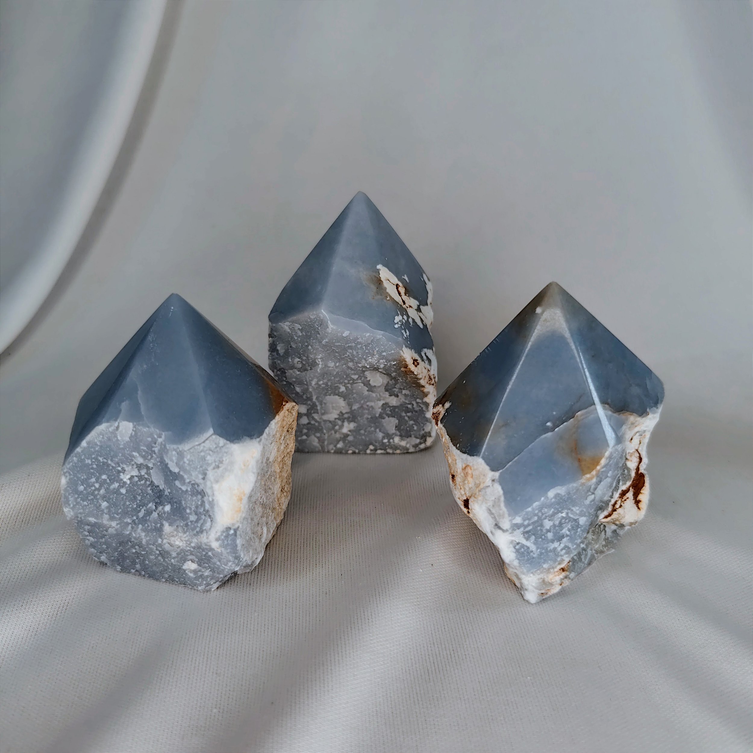 Angelita - Esse cristal aumenta a nossa percepção, facilitando o processo de renascimento. Ele estimula a cura e abre portas para a canalização psíquica. Representa a paz e a fraternidade.