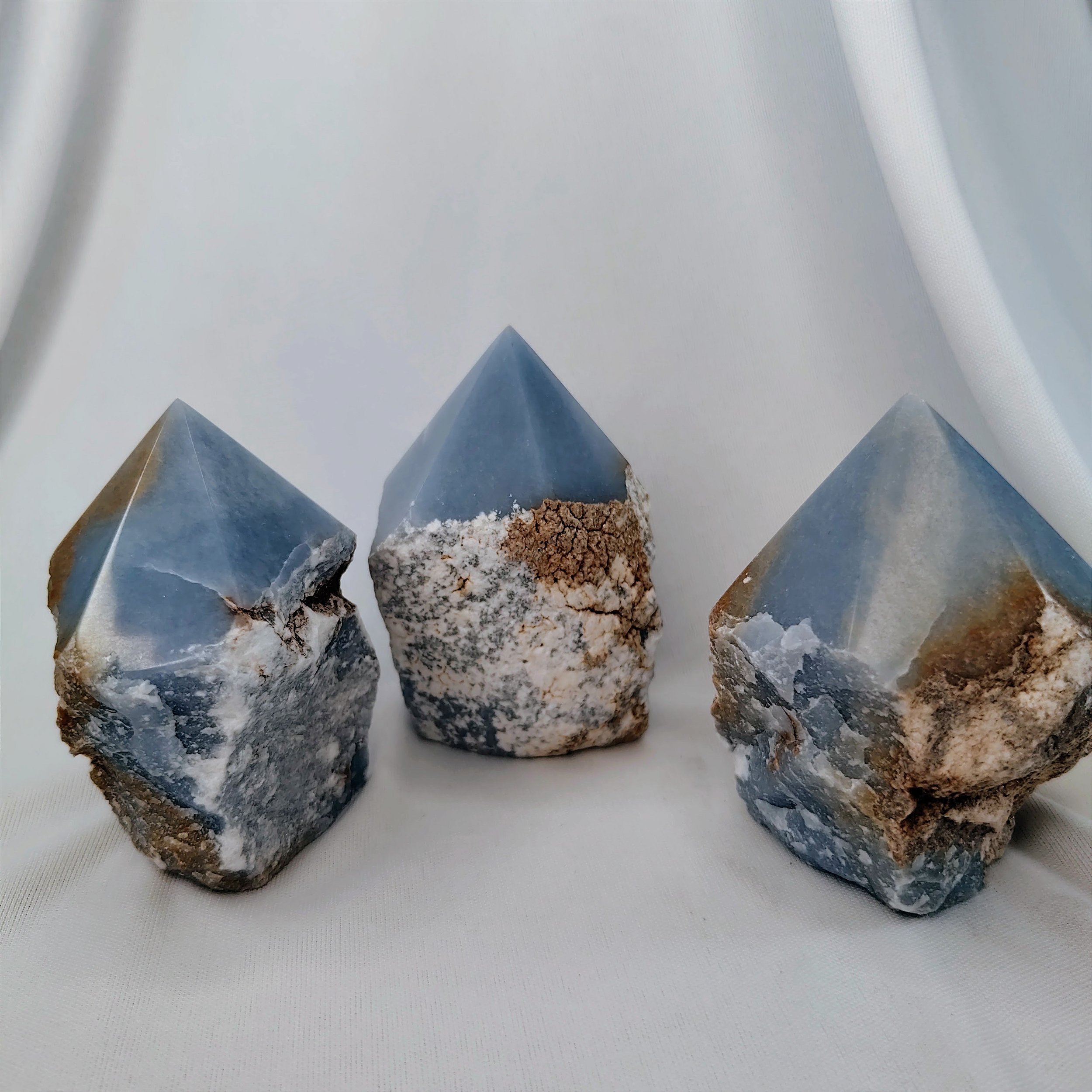 Angelita - Esse cristal aumenta a nossa percepção, facilitando o processo de renascimento. Ele estimula a cura e abre portas para a canalização psíquica. Representa a paz e a fraternidade.